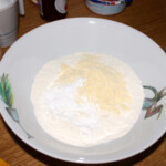 Do dużej miski przesiej 230 g mąki pszennej, 30 g mąki kukurydzianej i 1 łyżeczkę proszku do pieczenia.