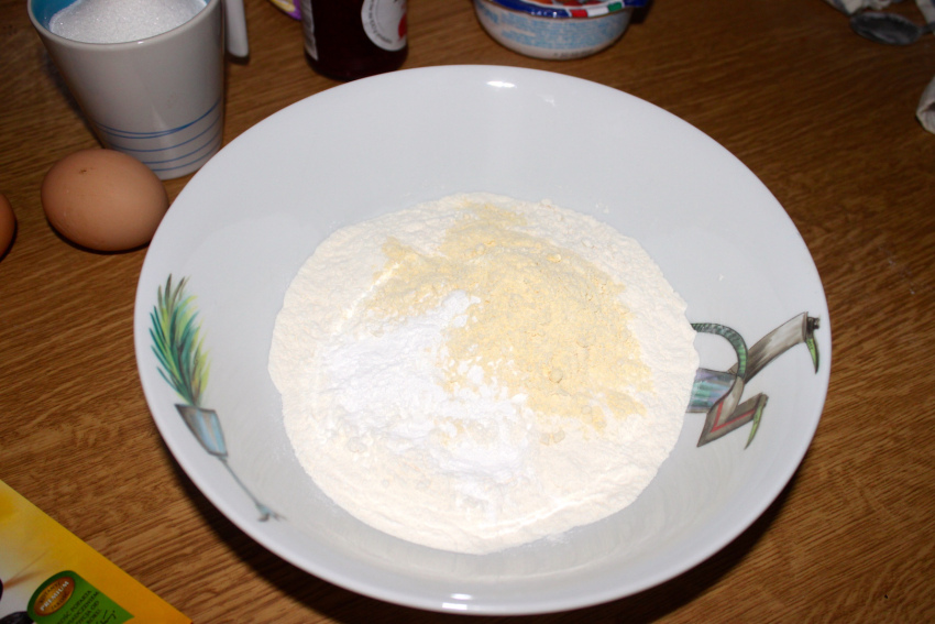 Do dużej miski przesiej 230 g mąki pszennej, 30 g mąki kukurydzianej i 1 łyżeczkę proszku do pieczenia.