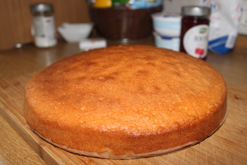 Przestudzony biszkopt delikatnie przekrój w poprzek na dwie równe połowy.