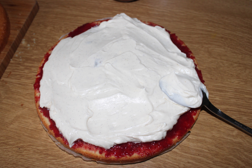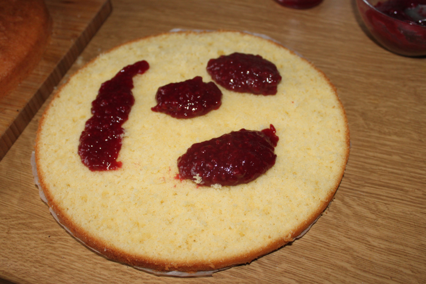 Spód biszkoptu wysmaruj 3 łyżkami dżemu malinowego.
