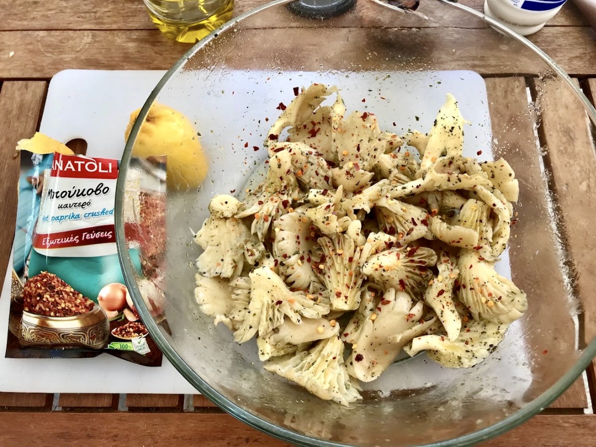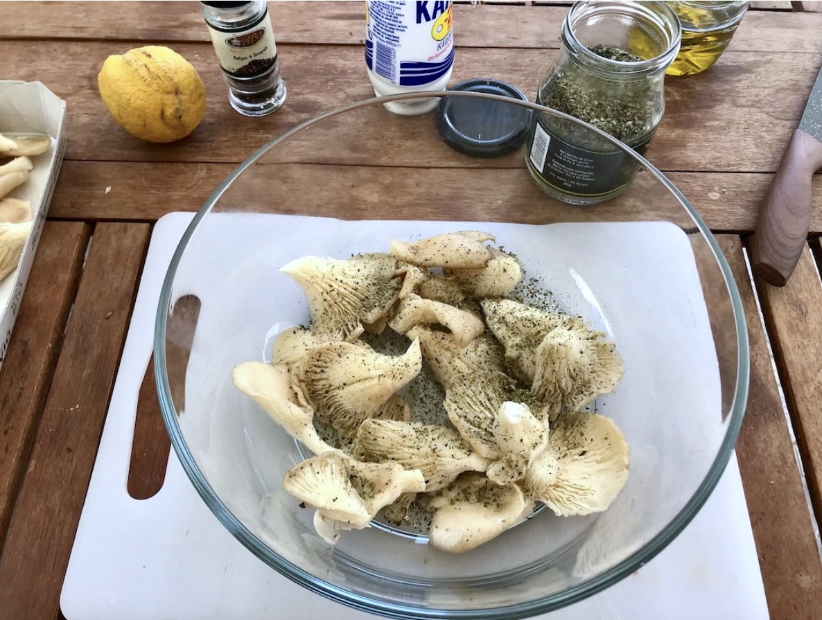 Marynowanie: Oczyszczone grzyby wrzuć do miski. Posyp je dość obficie suszonym oregano, posól i wlej kilka łyżek oliwy z oliwek. Dodaj świeżo wyciśnięty sok z połowy cytryny oraz pół łyżeczki suszonych płatków chilli.
