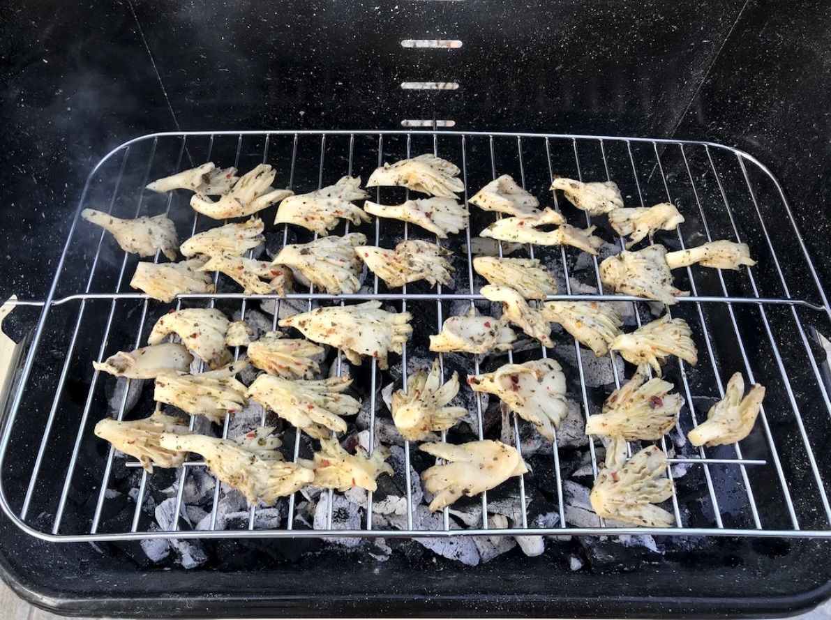 Serwowanie: Grilluj boczniaki, aż pięknie się zrumienią i staną chrupiące. Podawaj od razu po zdjęciu z grilla.