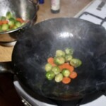 Smażenie główne: Zwiększ ogień, wrzuć podgotowaną brukselkę i marchewkę. Smaż przez ok. 2 minuty, aż warzywa lekko się zrumienią.