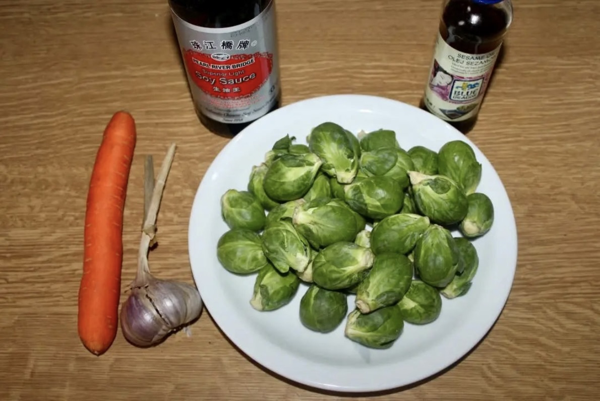 Warzywa: Brukselkę oczyść z wierzchnich liści, odetnij końcówki, umyj i osusz. Marchewkę pokrój w cienkie plasterki. Czosnek obierz, usuń kiełek ze środka i zgnieć nożem.