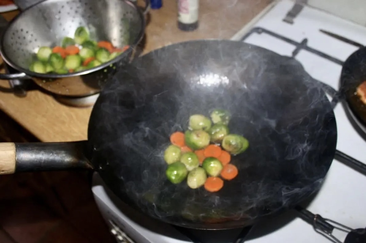 Podgotowanie: W woku zagotuj wodę, wrzuć brukselkę oraz marchewkę i gotuj przez około 5 minut od momentu ponownego wrzenia. Odcedź na durszlaku.