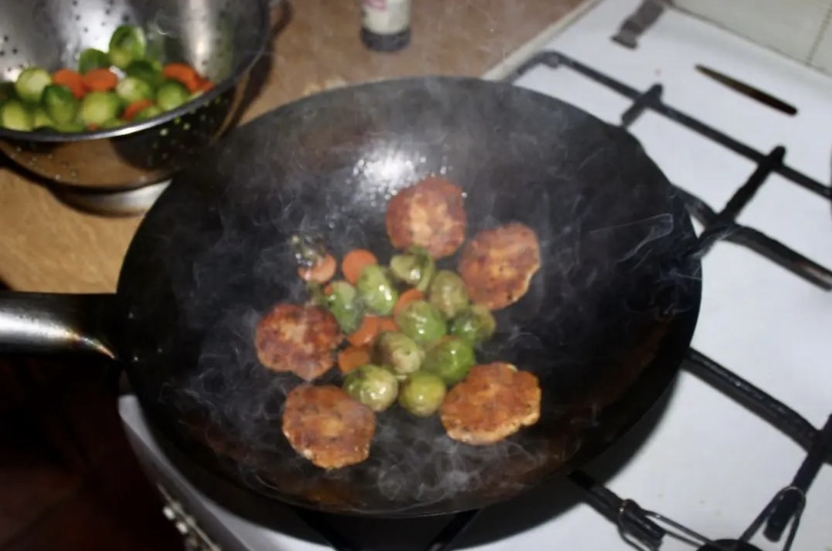 Smażenie główne: Zwiększ ogień, wrzuć podgotowaną brukselkę i marchewkę. Smaż przez ok. 2 minuty, aż warzywa lekko się zrumienią.