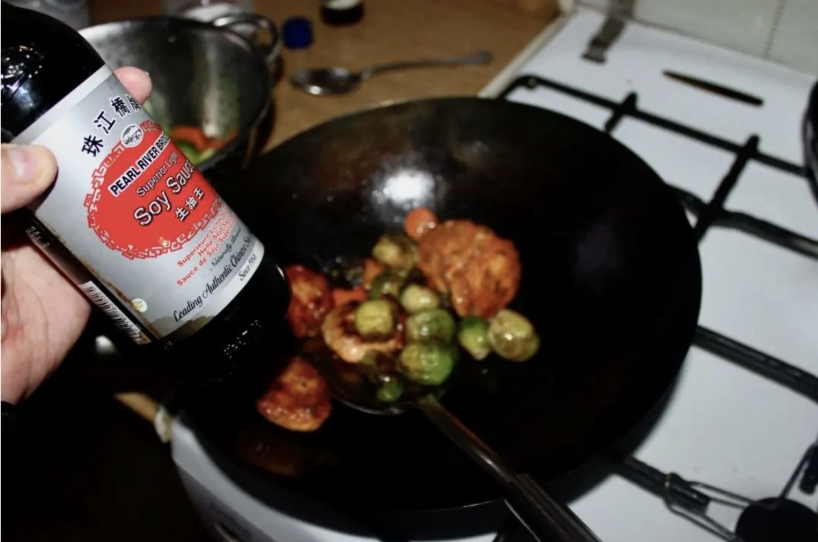 Doprawianie: Zmniejsz ogień do minimum. Dodaj sos sojowy, sos ostrygowy oraz świeżo zmiażdżony biały pieprz. Delikatnie wymieszaj i wyłącz gaz.