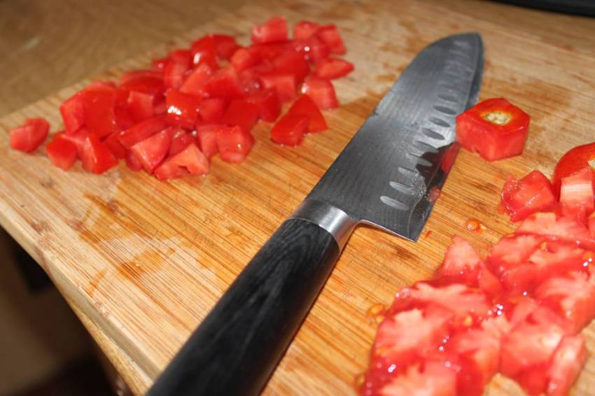 Pomidory: Umyte i osuszone pomidory pokrój na ćwiartki. Usuń gniazda nasienne, a miąższ pokrój w drobną kostkę.