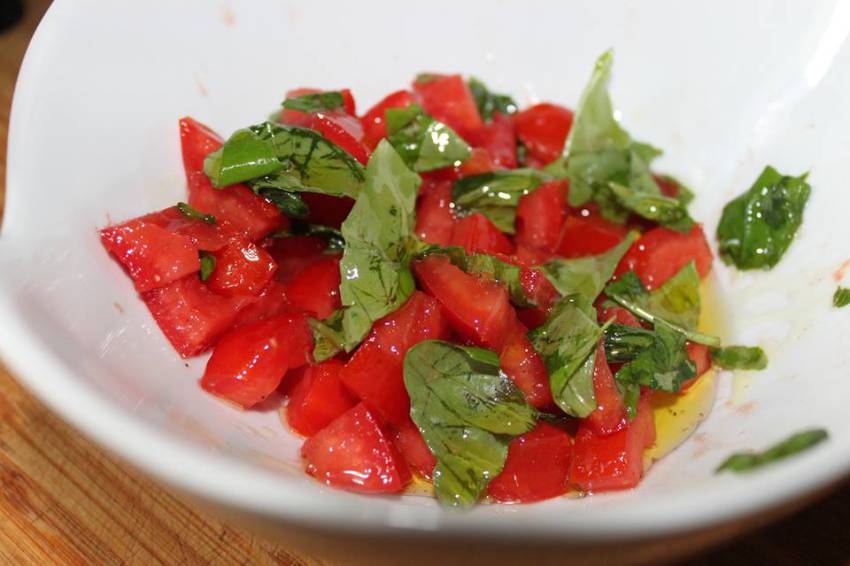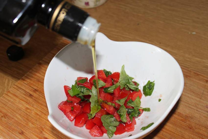 Marynowanie: Wrzuć pomidory do miski, dopraw solą i pieprzem. Wlej sporo oliwy i dodaj porwane listki bazylii. Wymieszaj dokładnie, aby soki połączyły się z oliwą.