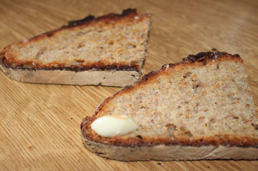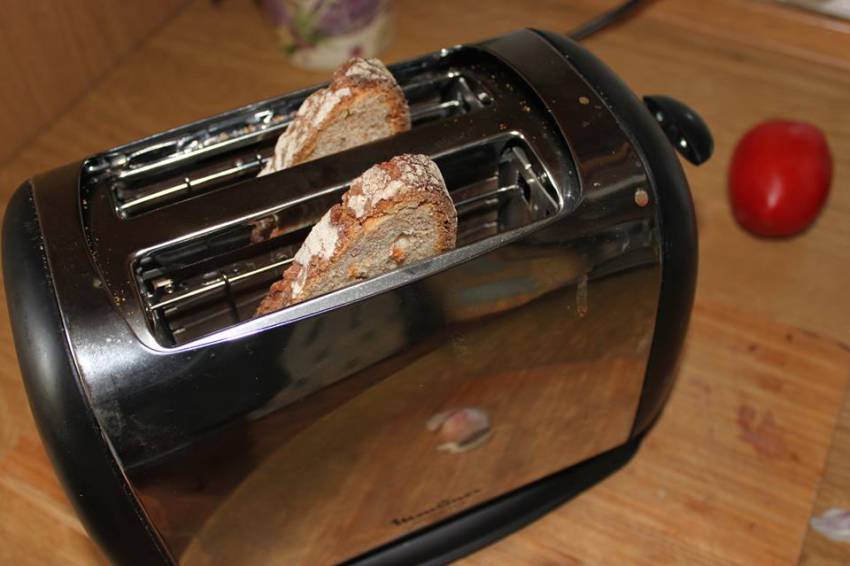 Opiekanie pieczywa: Kilka kromek chleba wiejskiego (o grubości ok. 1 cm) włóż do opiekacza lub przyrumień na ruszcie. Pieczywo powinno stać się chrupkie z zewnątrz, ale pozostać puszyste w środku. Autor odradza używanie miękkiego, białego pieczywa tostowego.