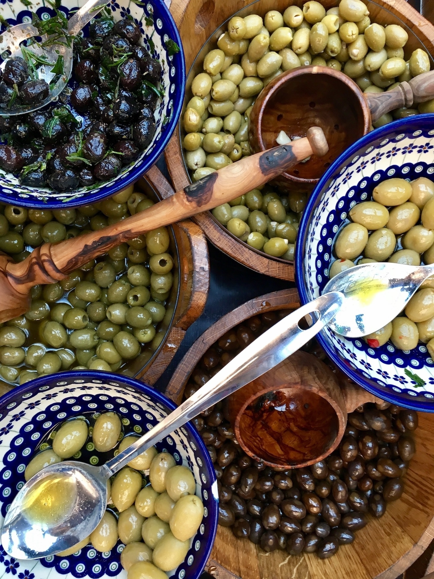 Podanie: Gotowe grzanki podawaj na świeżych liściach rukoli w towarzystwie oliwek Kalamata.