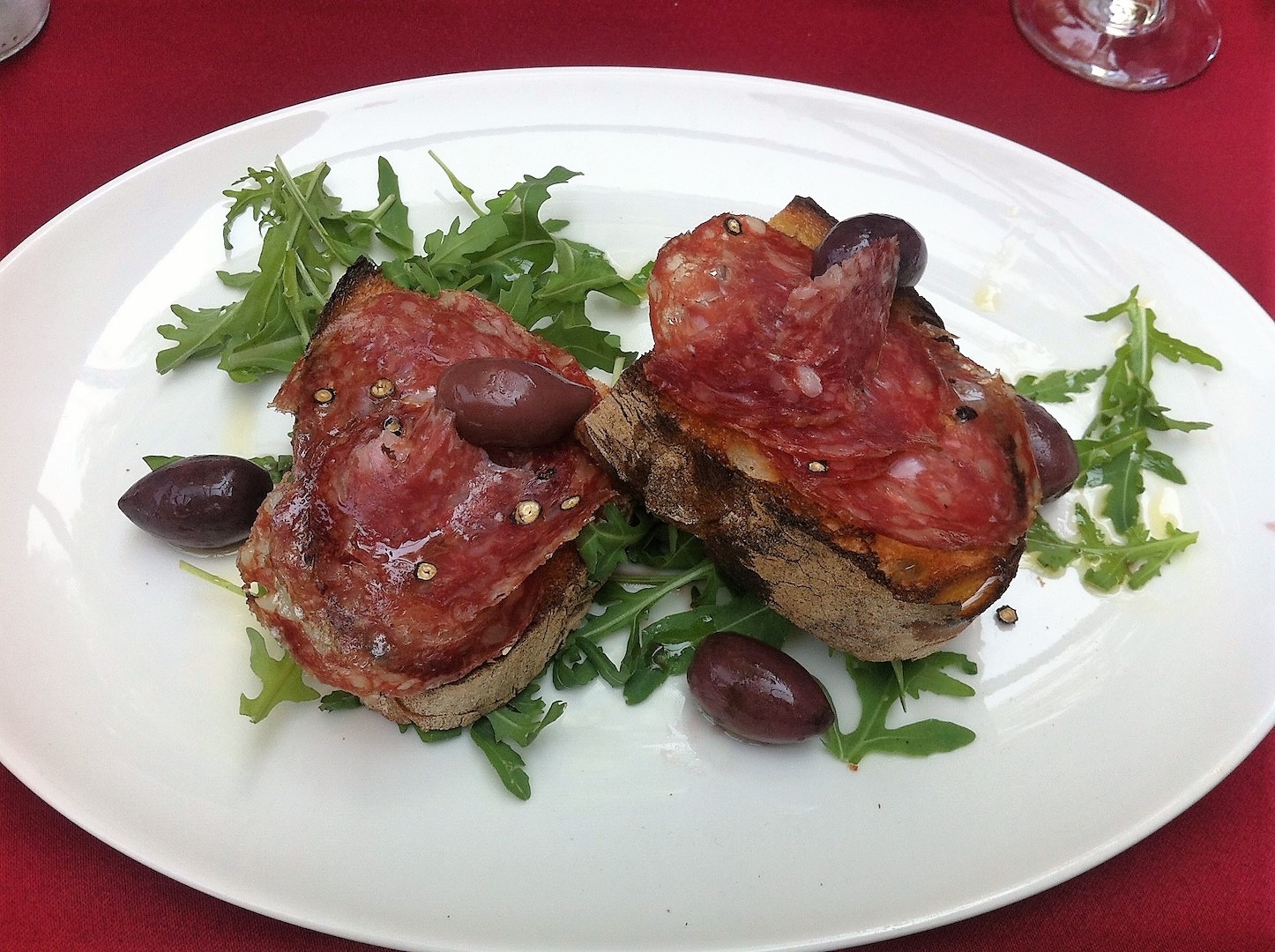 Bruschetta z salami to kromki opiekanego chleba na zakwasie skropione oliwą extra vergine, a następnie obłożone wybornym włoskim salami z pieprzem i podane na rukoli z oliwkami. Tłumacząc z włoskiego na polski bruschetta to po prostu grzanka obłożona dowolnymi składnikami. W tym przypadku moimi ulubionymi składnikami, czyli ostrym salami i świeżą pieprzową rukolą. Ostatnimi laty coraz częściej do przygotowania bruschetty podsuwa się nam białe pieczywo, co jest absolutnie niezgodne z tradycjami włoskimi. Cóż zrobić, skoro nawet Włosi coraz częściej łamią swoje tradycje?