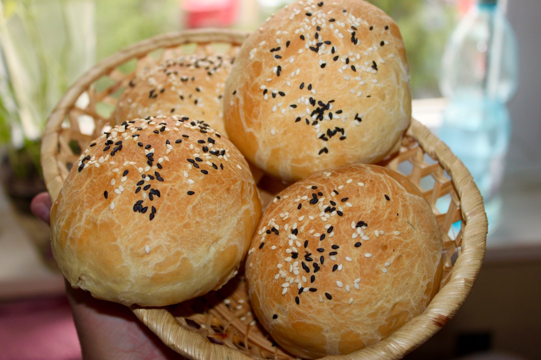 Przed włożeniem do piekarnika posmaruj bułki roztopionym masłem lub roztrzepanym białkiem kurzym, a następnie posyp sezamem.