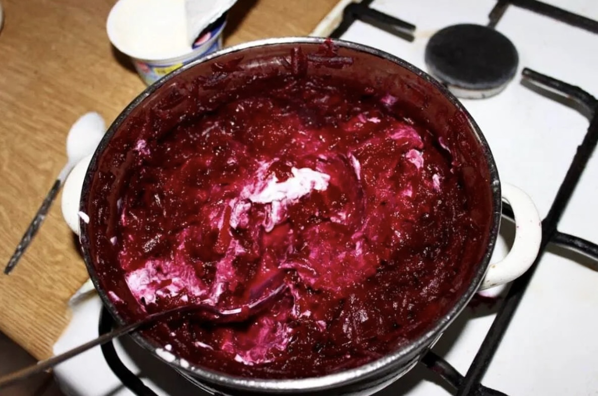 Na koniec wlej do buraków 1 łyżkę dobrej, kwaśnej śmietany i dokładnie wymieszaj.