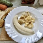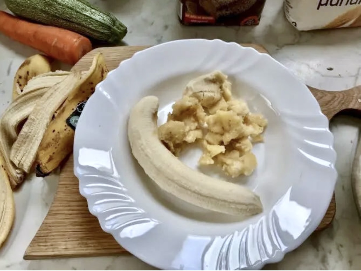 Przygotowanie bananów: W osobnej misce obierz banany ze skórek, a następnie dobrze je rozgnieć widelcem.