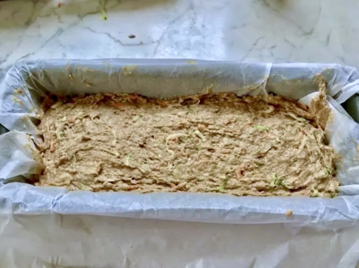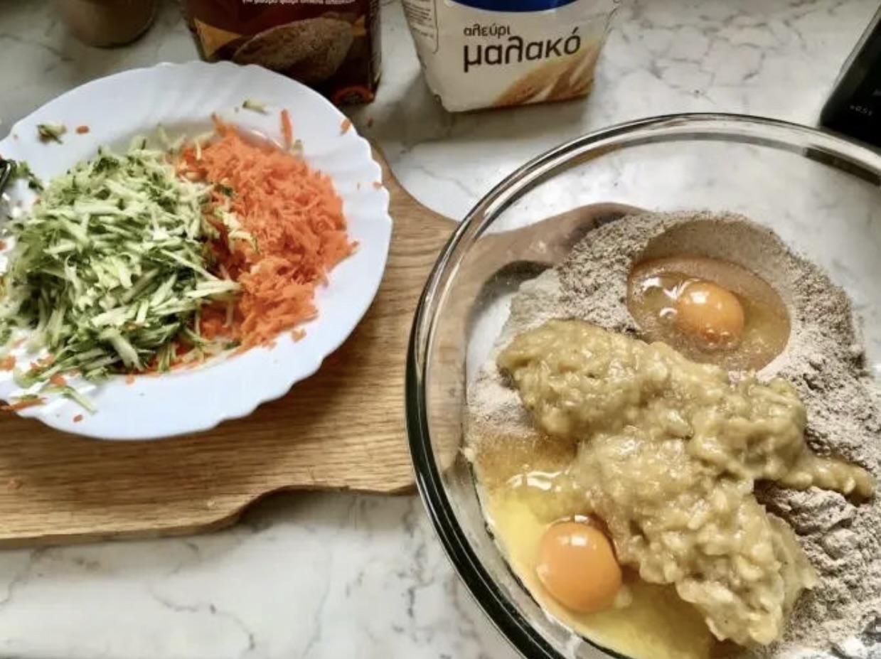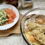 Dodawanie warzyw: Zetrzyj marchewkę oraz cukinię na dużych oczkach tarki. Warzyw powinno być mniej więcej po jednej dużej garści. Dodaj starte warzywa do ciasta.