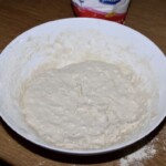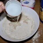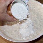 Etap 2 (8 godzin): Po 8 godzinach ciasto należy „dokarmić”. Dodaj 1 szklankę mąki pełnoziarnistej i powoli wlewaj 1 szklankę ciepłej wody, delikatnie mieszając. Następnie dodaj kolejną (czwartą) szklankę mąki pszennej uniwersalnej. Lekko ugnieć rękami (ciasto będzie lepkie). Przykryj i odstaw ponownie na około 8 godzin.