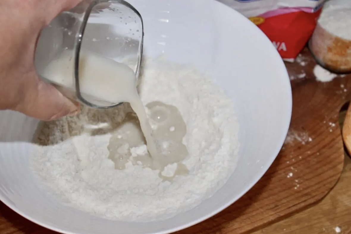 Etap 1 (8 godzin): Do dużej miski wsyp 2 szklanki mąki typ 550. Wlej rozczyn. Stopniowo wlewaj 1 szklankę wody i delikatnie mieszaj, aby połączyć składniki. Posyp wierzch kolejną (trzecią) szklanką mąki pszennej, przykryj folią i odstaw w ciepłe miejsce na około 8 godzin.