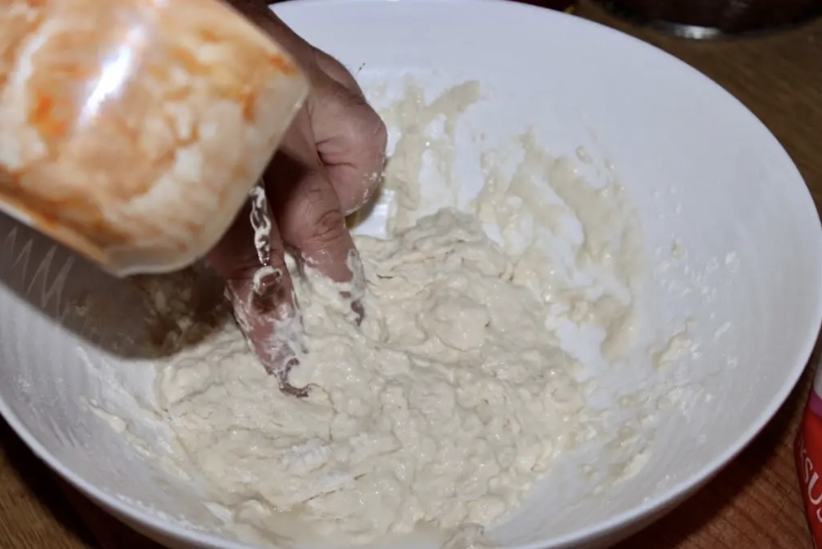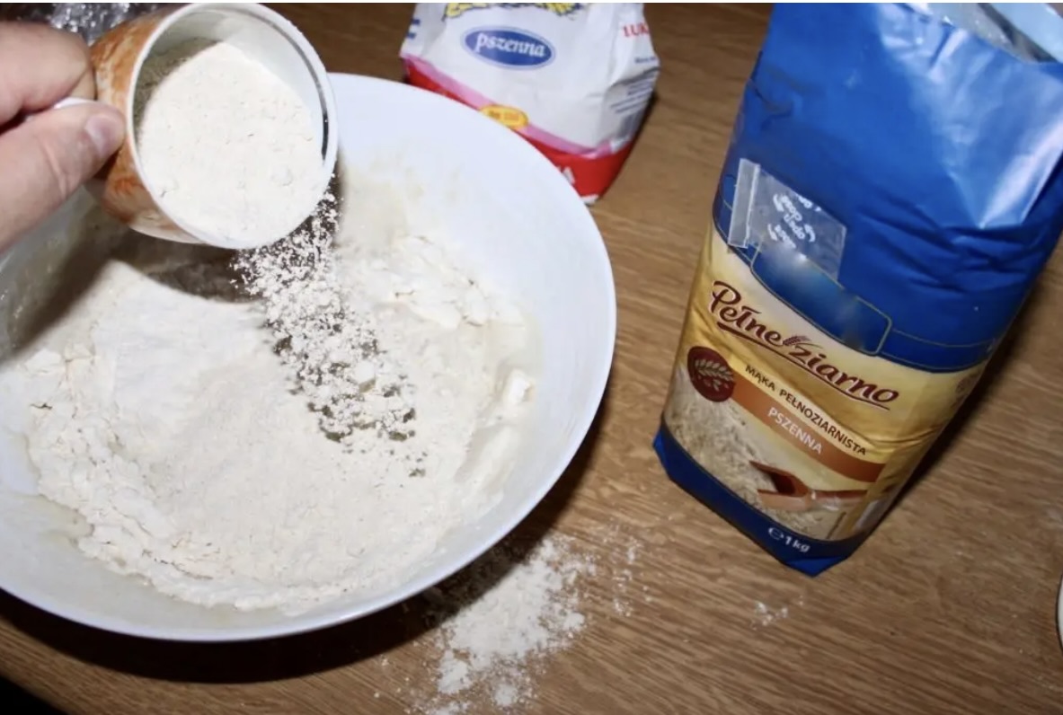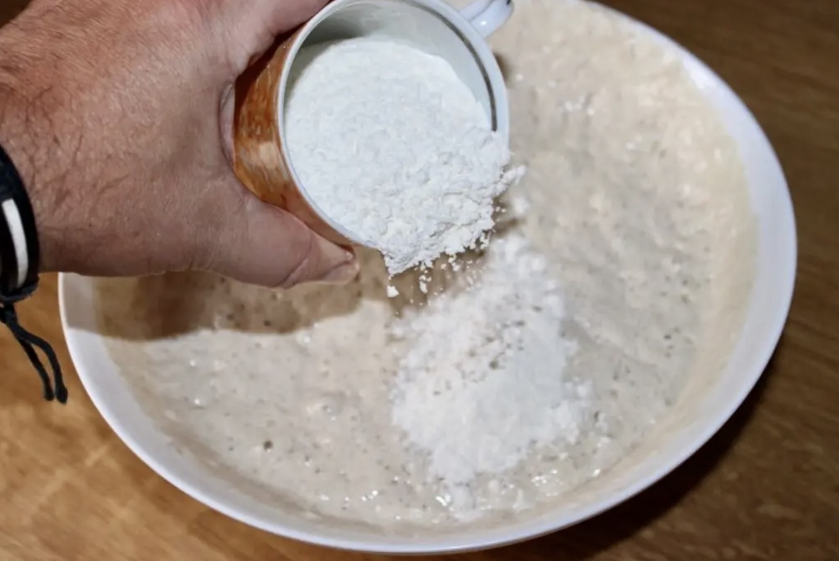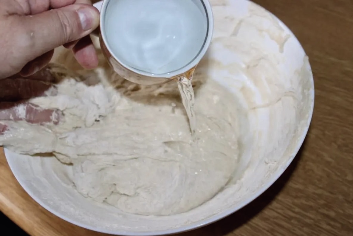 Etap 2 (8 godzin): Po 8 godzinach ciasto należy „dokarmić”. Dodaj 1 szklankę mąki pełnoziarnistej i powoli wlewaj 1 szklankę ciepłej wody, delikatnie mieszając. Następnie dodaj kolejną (czwartą) szklankę mąki pszennej uniwersalnej. Lekko ugnieć rękami (ciasto będzie lepkie). Przykryj i odstaw ponownie na około 8 godzin.