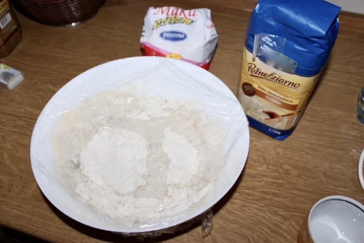 Przykryj szczelnie folią spożywczą i odstaw w ciepłe miejsce na 3 godziny (ciasto może zwiększyć objętość nawet 6-krotnie).