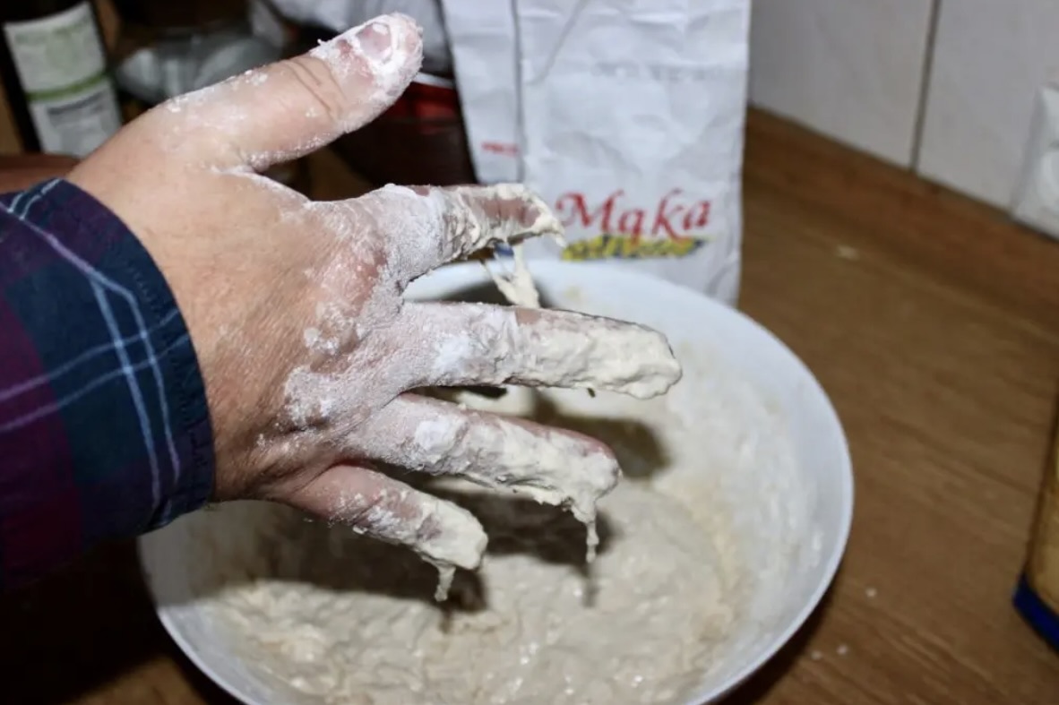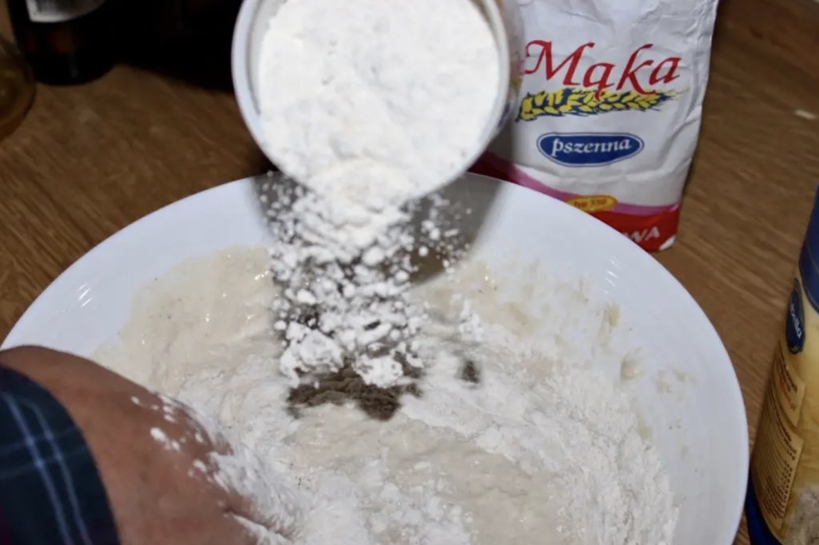 Etap 3 (Główne Zagniecenie): Wlej pozostałe 1,5 szklanki ciepłej wody, a następnie stopniowo dodawaj resztę mąki (około 5 szklanek, zostawiając część do podsypywania).