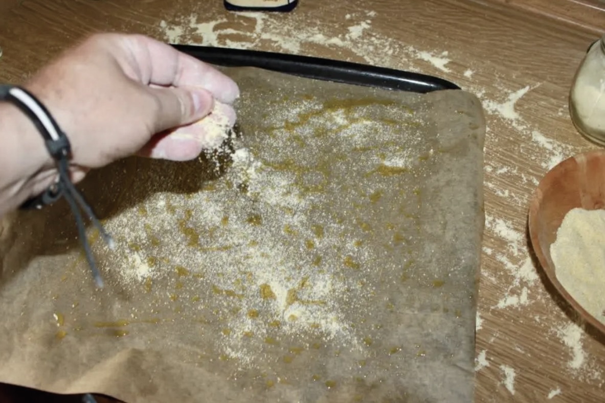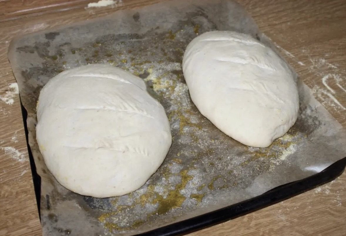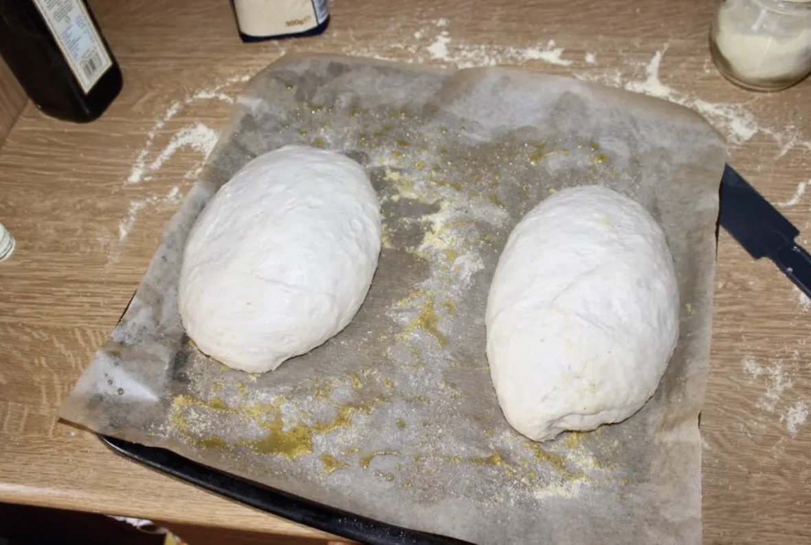 Połóż bochenki na blasze wyłożonej papierem do pieczenia, skropionej oliwą i posypanej kaszką kukurydzianą.