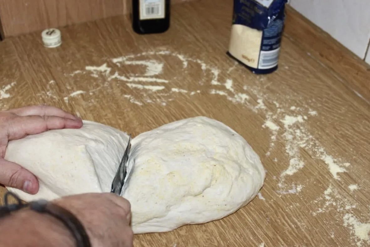Przetnij na pół i uformuj dwa bochenki, delikatnie zawijając ciasto „pod spód”.