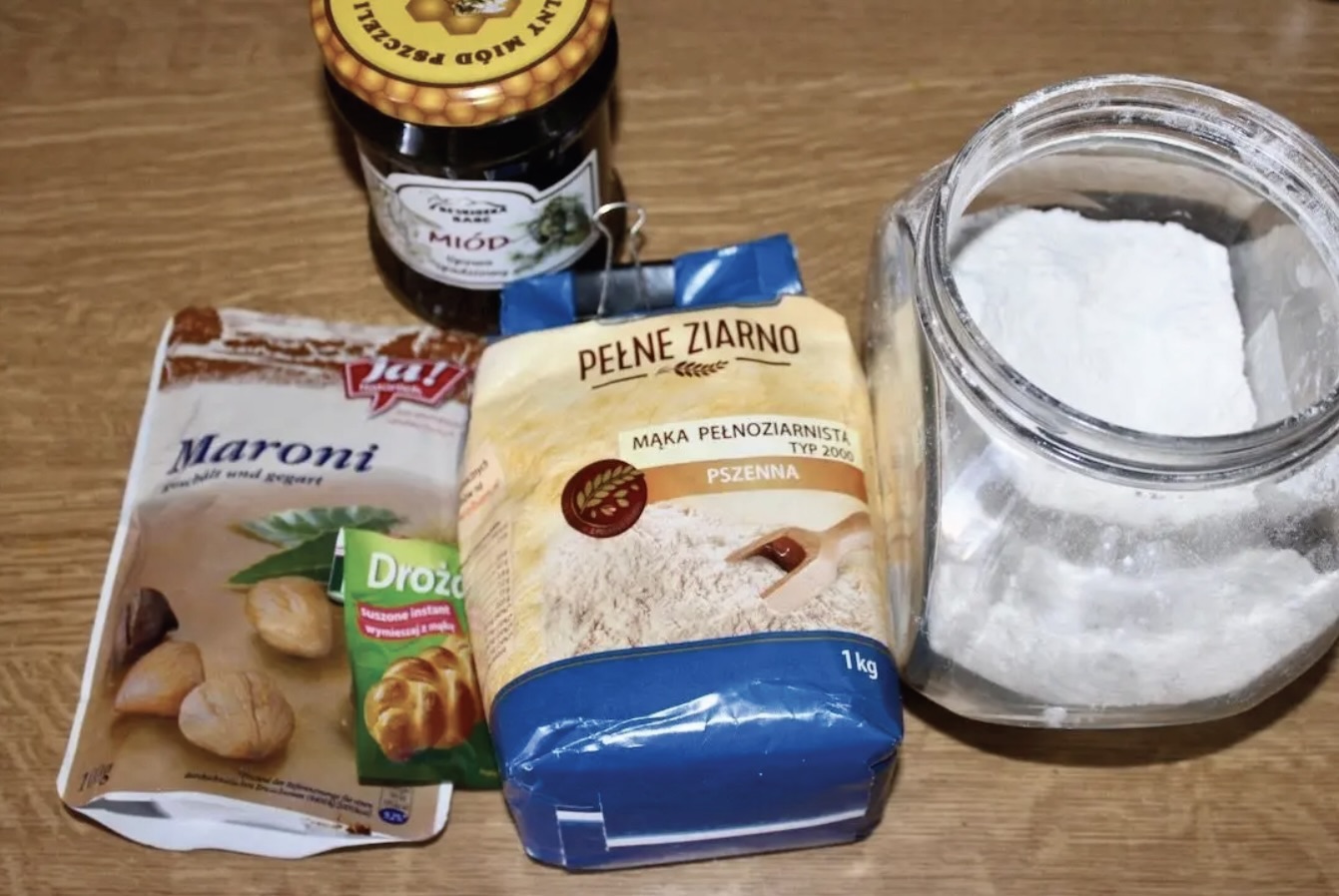 Uwaga: Ilości składników są na niedużą bagietkę. Jeśli chcesz upiec większy chleb, zwiększ proporcjonalnie ilość składników.