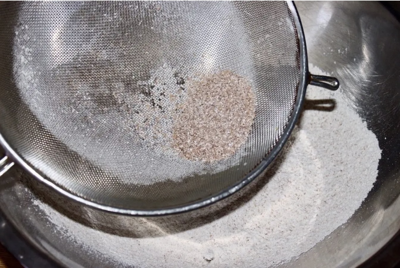 Do miski przesiej oba rodzaje mąki (pełnoziarnistą i zwykłą). Nie wyrzucaj „śrutu” z mąki pełnoziarnistej, tylko dodaj go do miski.