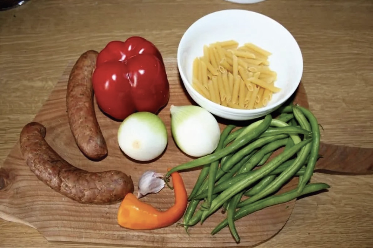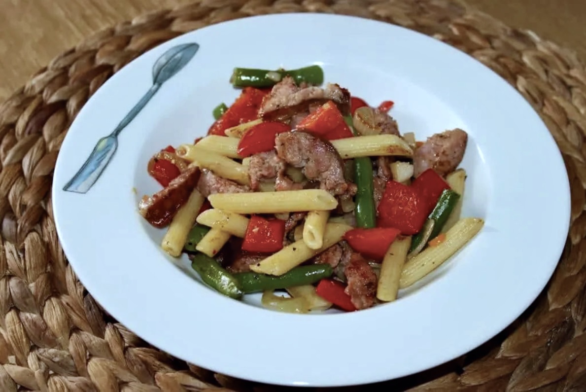 Chłopskie jadło to odpowiednia nazwa dla mojego makaronu z kiełbasą zwyczajną i warzywami. Choć są tutaj warzywa, to obecność makaronu (zamiast ziemniaków), zwyczajnej kiełbasy, cebuli i czosnku oraz sposób przyrządzenia dania wskazuje na jego pożywność, prostotę i oczywiście tradycyjny charakter. Innymi słowy, to po prostu danie z tego, co w lodówce akurat zbędne. Ale czyż nie pisałem już kiedyś, że to właśnie w takich przypadkach rodzą się rzeczy nadzwyczajne? Jak dla mnie takie dania są kwintesencją lokalnego jedzenia. W lodówkach zwykle „zalegają” składniki, które są najpopularniejsze w danym regionie.