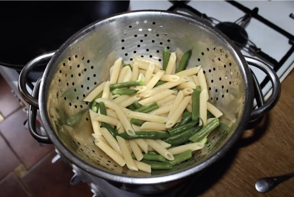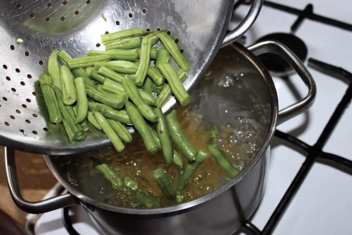 Gotowanie bazy: Fasolkę szparagową umyj, odetnij końcówki, a następnie pokrój w kawałki o długości makaronu. Wrzuć ją razem z makaronem do osolonego wrzątku. Gotuj około 10 minut (zgodnie z czasem podanym na opakowaniu makaronu – fasolka powinna zmięknąć w tym samym czasie). Po ugotowaniu odcedź.