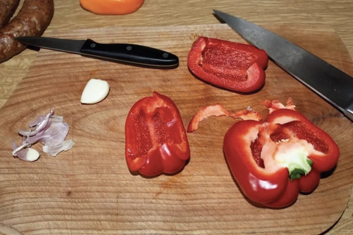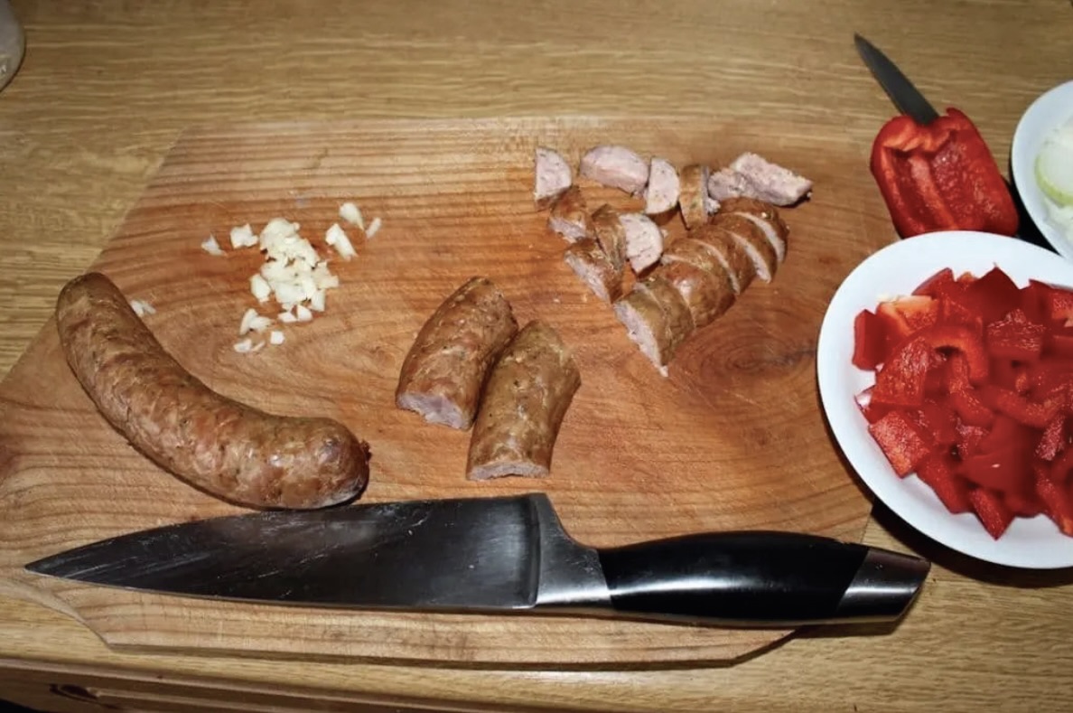 Krojenie: Cebulę pokrój w piórka, paprykę w kostkę lub paski, a kiełbasę w półplasterki. Czosnek i chilli drobno posiekaj.