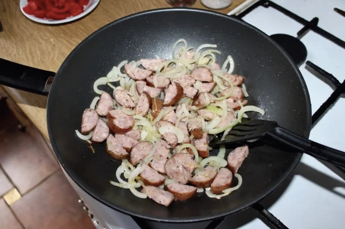 Smażenie: Na patelni rozgrzej odrobinę oleju (ilość zależy od tego, jak tłusta jest kiełbasa). Najpierw zeszklij cebulę, potem dodaj kiełbasę, a następnie smaż przez około 2 minuty, aby się podgrzała.