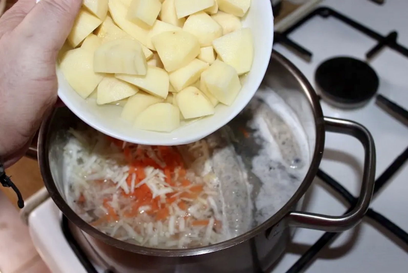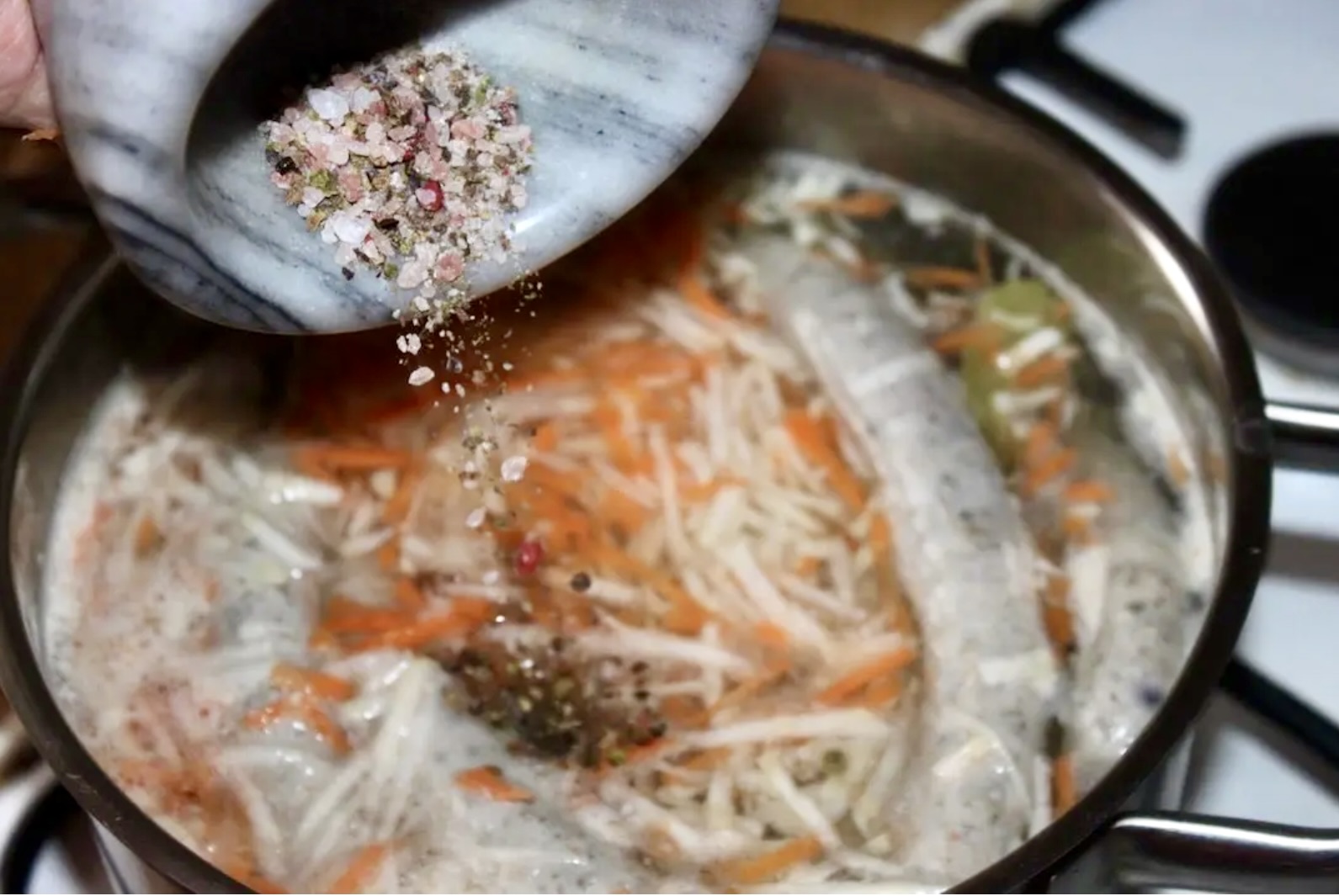 Warzywa i przyprawy: Dodaj do wywaru pokrojone w kostkę ziemniaki oraz starte na dużych oczkach pozostałe warzywa (mała ilość, by tylko wzbogacić smak). Wsyp utarte w moździerzu ziele angielskie z pieprzem i solą.