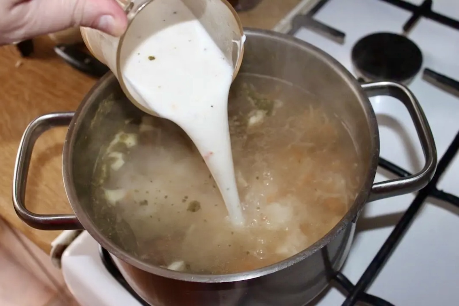Zagęszczanie: W szklance rozpuść 1 kopiastą łyżeczkę mąki pszennej w zimnej wodzie, dodaj kwaśną śmietanę, wymieszaj, zahartuj odrobiną gorącej zupy i wlej do garnka, zagotuj.