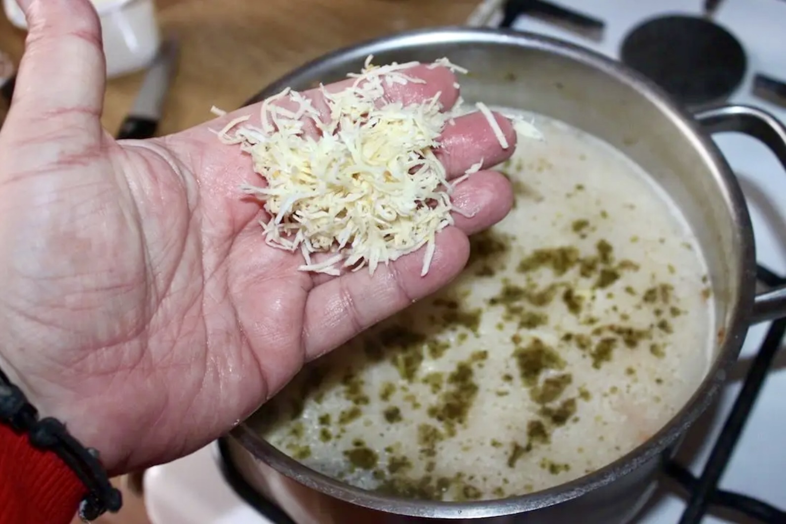 Chrzan: Dodaj starty chrzan. Ilość chrzanu należy dobrać do smaku i mocy korzenia – zupa powinna mieć wyraźny posmak chrzanu, ale nie być zbyt ostra. W razie potrzeby dopraw solą, pieprzem, czosnkiem lub majerankiem.