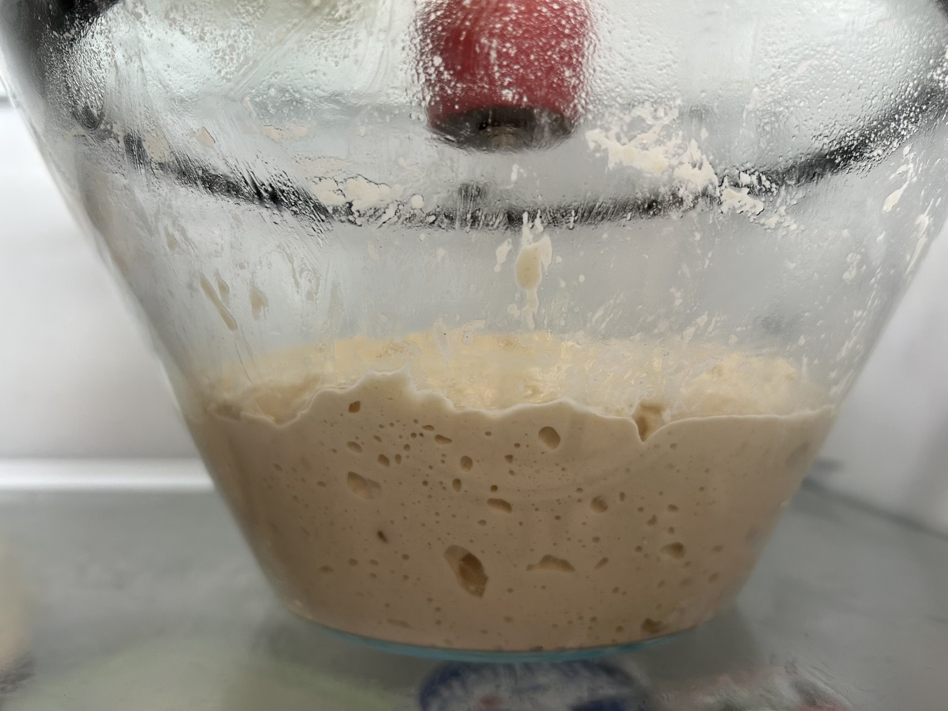 Przygotowanie ciasta: Do większej miski przesiej 2 szklanki mąki pszennej (i opcjonalnie mąkę pełnoziarnistą). Dodaj 1 łyżeczkę soli, a następnie wlej gotowy zaczyn drożdżowy.