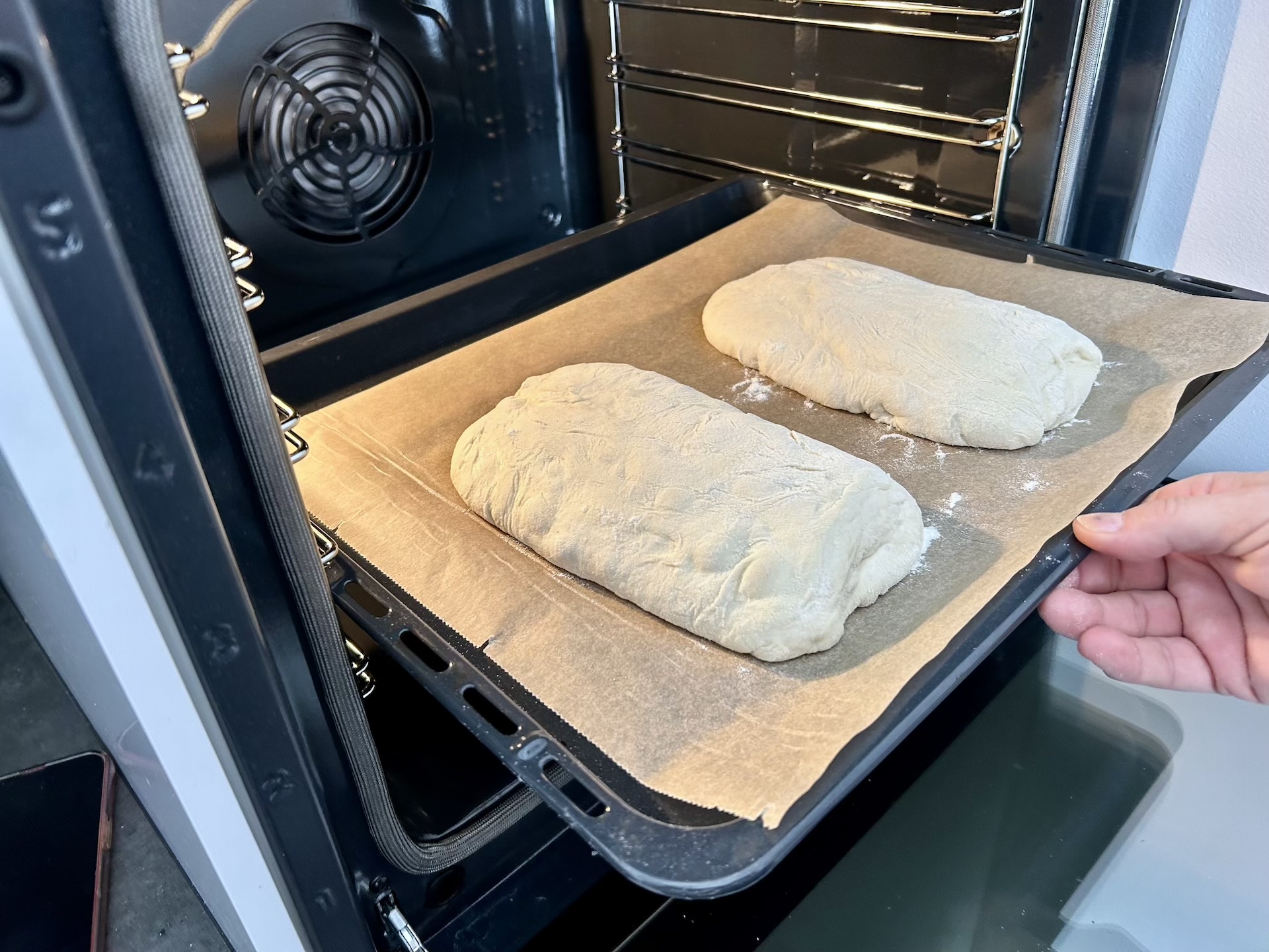 Pieczenie: Rozgrzej piekarnik do temperatury 250°C. Spryskaj wnętrze piekarnika wodą (np. spryskiwaczem do kwiatów) lub wrzuć na dno 10 dużych kostek lodu, aby wytworzyć parę, co zapewni chrupiącą skórkę. Natychmiast włóż ciasto. Piecz ciabattę przez 15 do 25 minut, aż się ładnie przyrumieni.