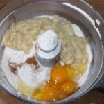 Wyrabianie ciasta: Do miski malaksera (lub innej dużej miski, jeśli używasz miksera) włóż wszystkie pozostałe składniki ciasta (mąkę, cukier, masło, jajka, cynamon, proszek do pieczenia) oraz ugniecione banany. Zmiksuj całość na gładką, dość gęstą masę.