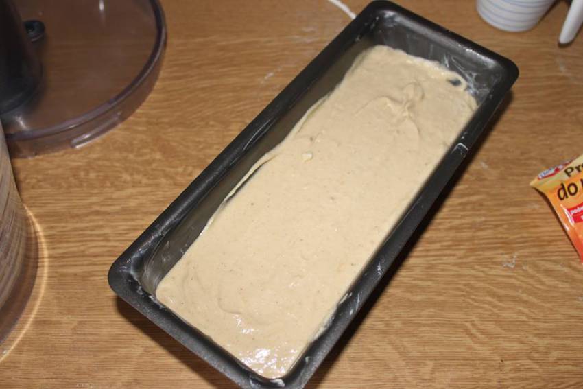 Wyrabianie ciasta: Do miski malaksera (lub innej dużej miski, jeśli używasz miksera) włóż wszystkie pozostałe składniki ciasta (mąkę, cukier, masło, jajka, cynamon, proszek do pieczenia) oraz ugniecione banany. Zmiksuj całość na gładką, dość gęstą masę.