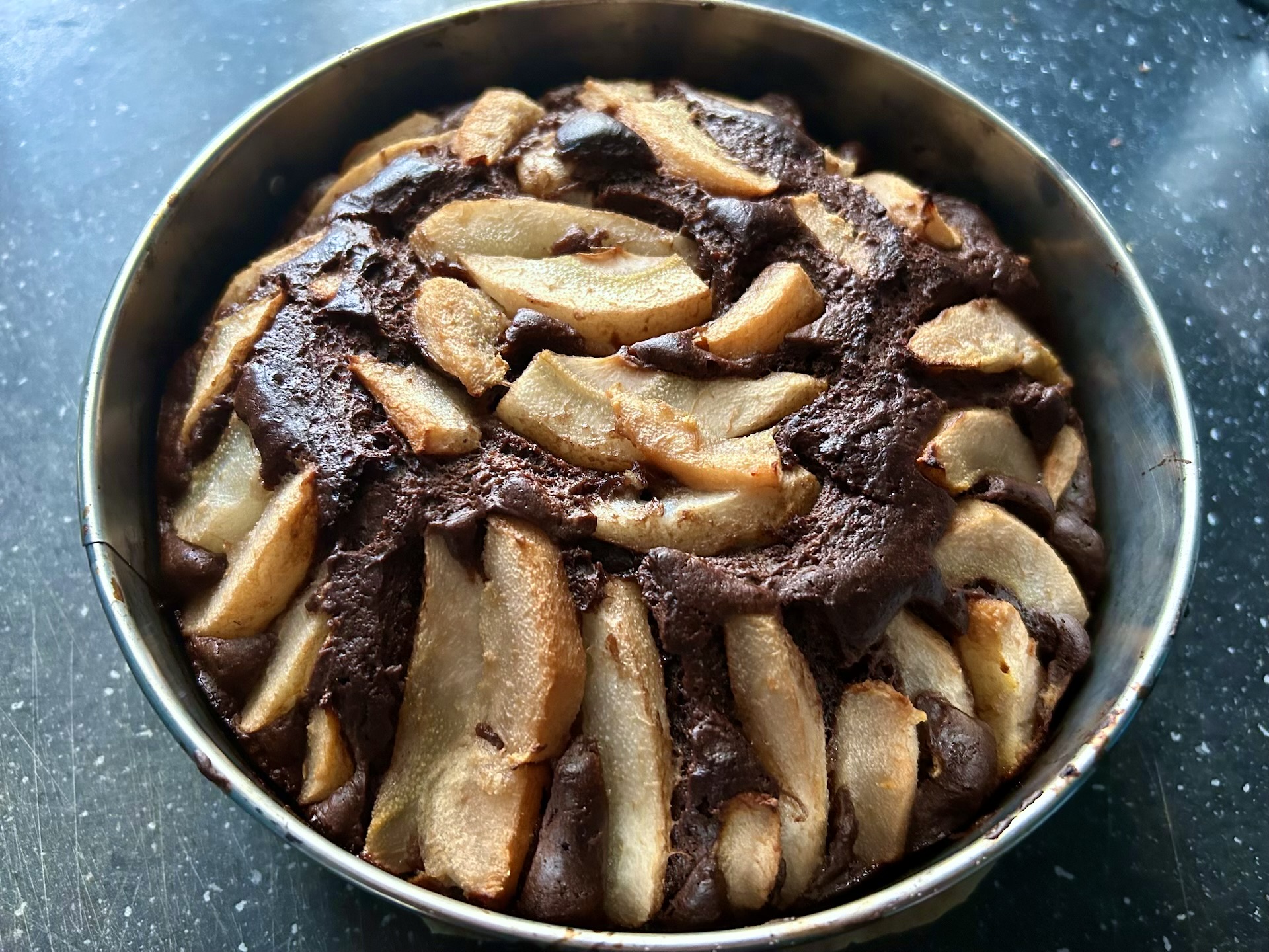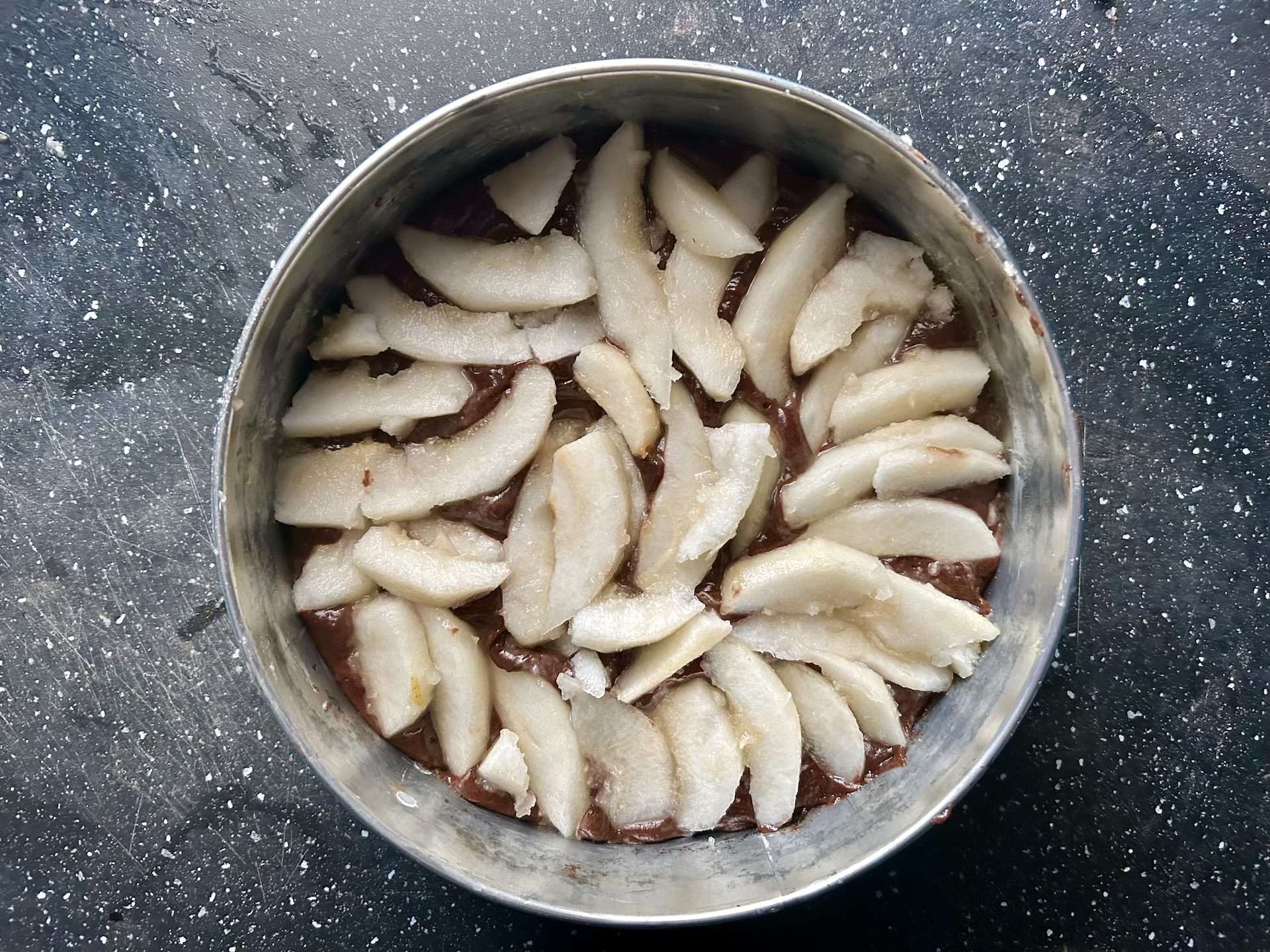 Na górze ułóż ciasno kawałki gruszek (można je lekko wcisnąć w masę).