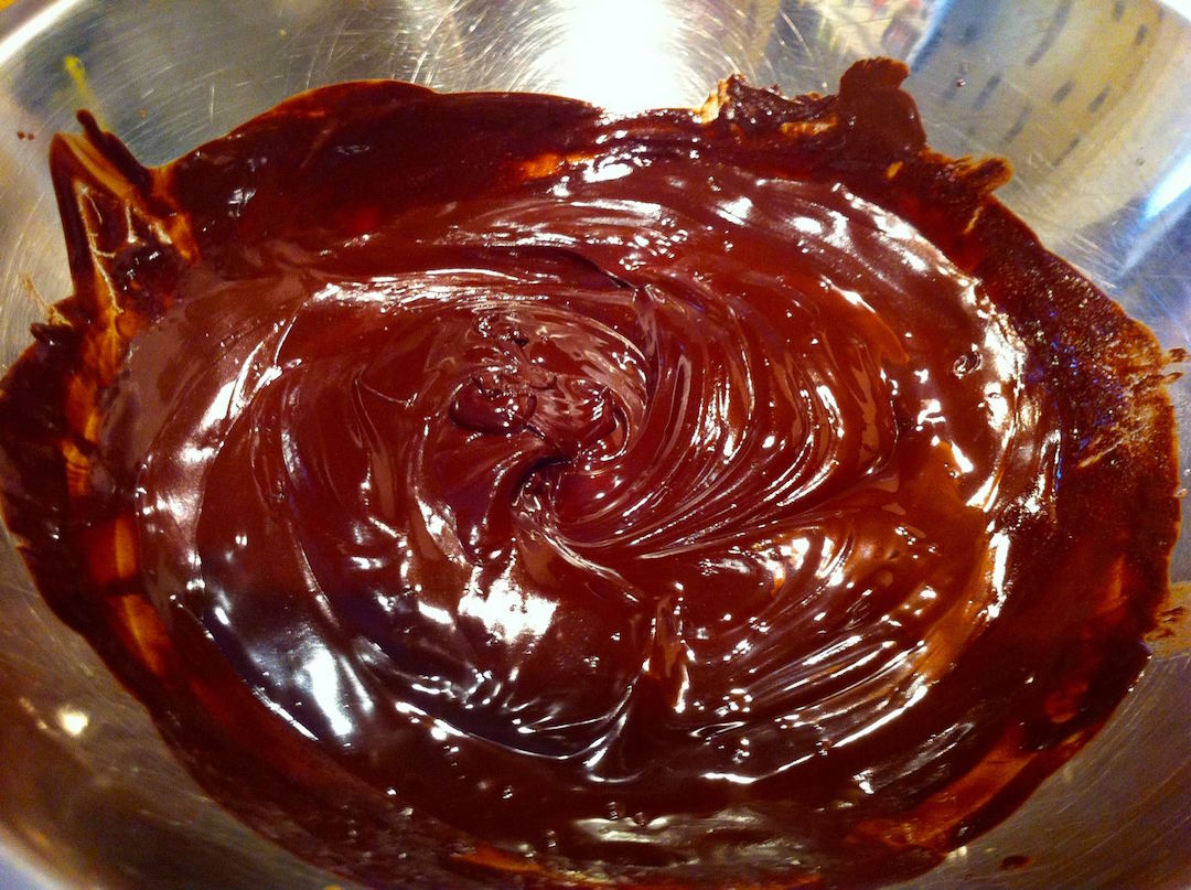 Rozpuszczanie czekolady i masła: W kąpieli wodnej (w dużej metalowej misce umieszczonej na garnku z gotującą się wodą, ale tak, by miska nie dotykała wody) roztop czekoladę i masło. Mieszaj, aż składniki się rozpuszczą i połączą w jednolitą, błyszczącą masę.