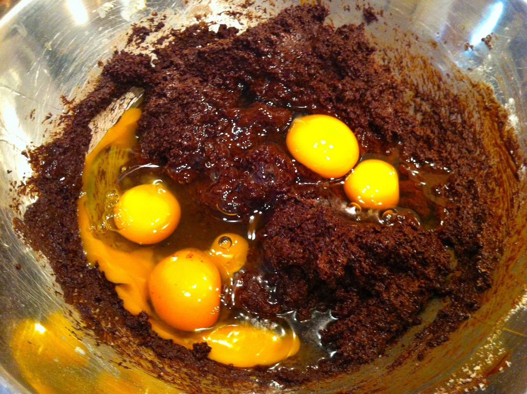 Dodanie jajek: Wbij jajka do ciasta i ponownie wymieszaj wszystko dokładnie, aż powstanie gładka masa.