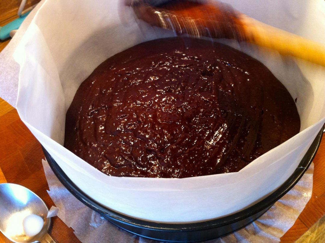 Pieczenie: Tortownicę o średnicy 24 cm wyłóż pergaminem tak, by wystawał znacznie ponad jej brzegi (wcześniej posmaruj formę olejem). Wlej masę czekoladowo-migdałową.