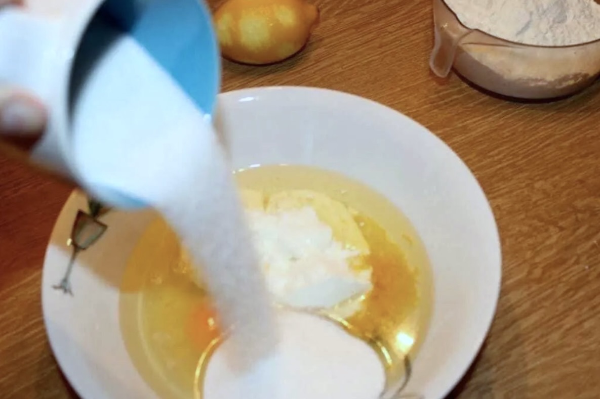 Przygotowanie płynnych składników: Do miski wlej olej, wbij jajka i wyciśnij sok z całej cytryny. Dodaj łyżkę startej skórki z cytryny. Następnie dodaj kubek gęstego jogurtu naturalnego i wsyp 3/4 szklanki cukru.