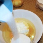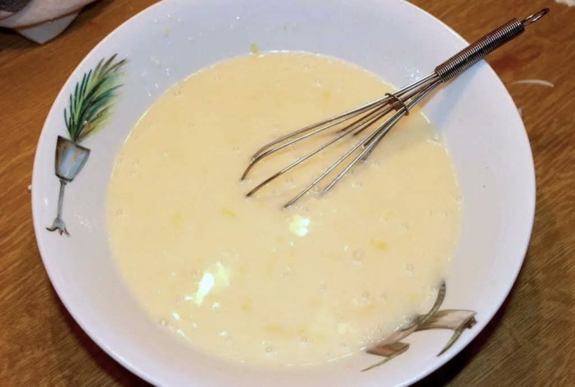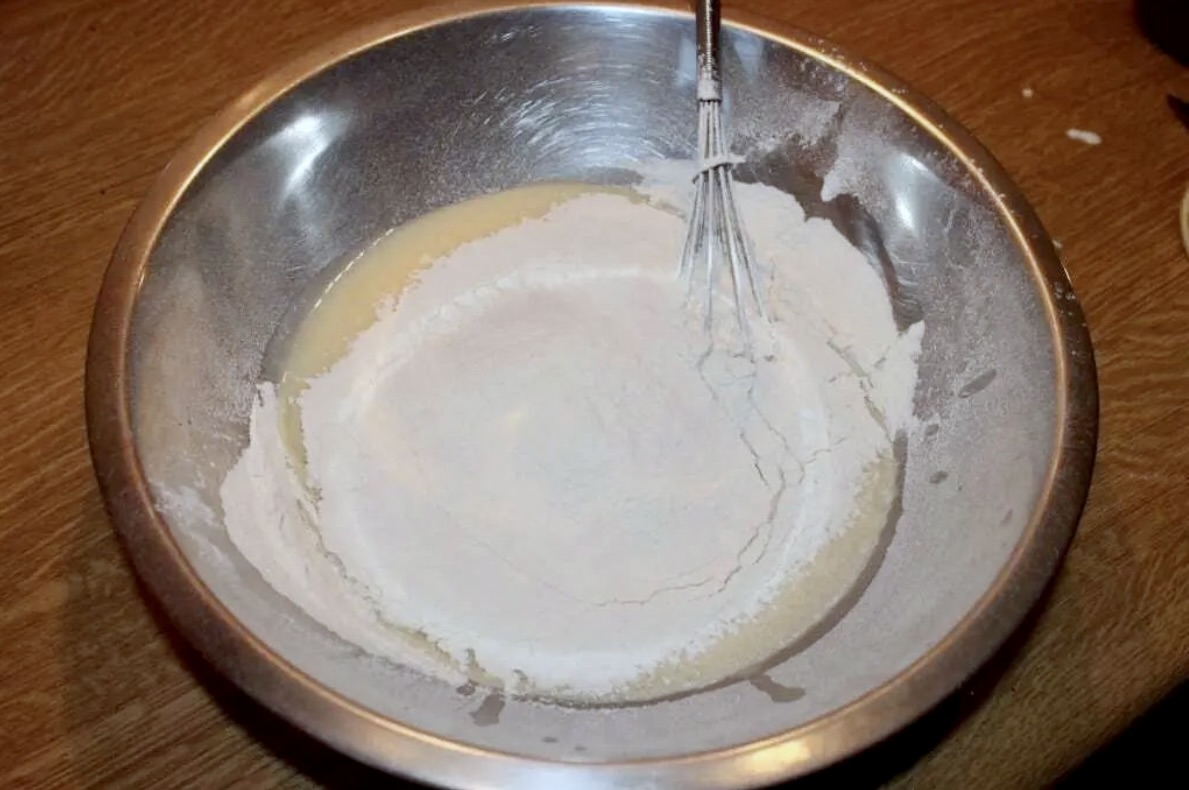 Dodanie suchych składników: Na koniec do masy dodaj przesianą mąkę z proszkiem do pieczenia i ponownie wymieszaj bardzo dokładnie.