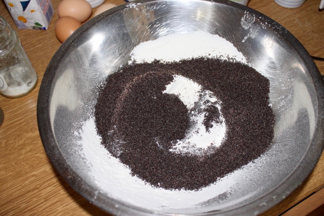 Przygotowanie składników suchych: Do dużej miski przesiej 300 gramów mąki pszennej i dodaj 1 łyżeczkę proszku do pieczenia. Dodaj wanilię (np. pastę, olejek, wydrążone ziarenka z laski lub cukier waniliowy). Dodaj 100 gramów mielonego maku. Wymieszaj i odstaw na bok.