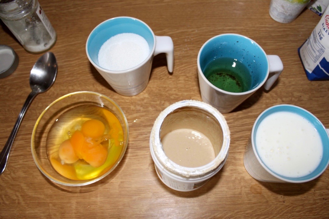Przygotowanie składników mokrych: W miseczce przygotuj 3 jajka, szklankę tłuszczu (oleju/tahiny), 180 gramów cukru oraz dużą szklankę jogurtu naturalnego.
