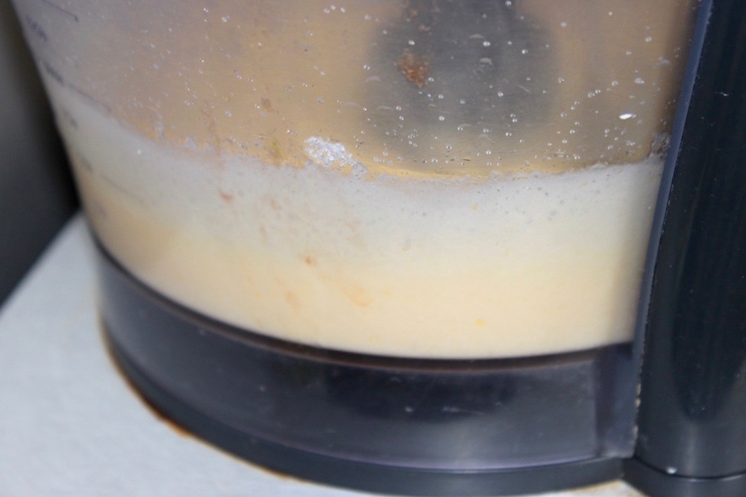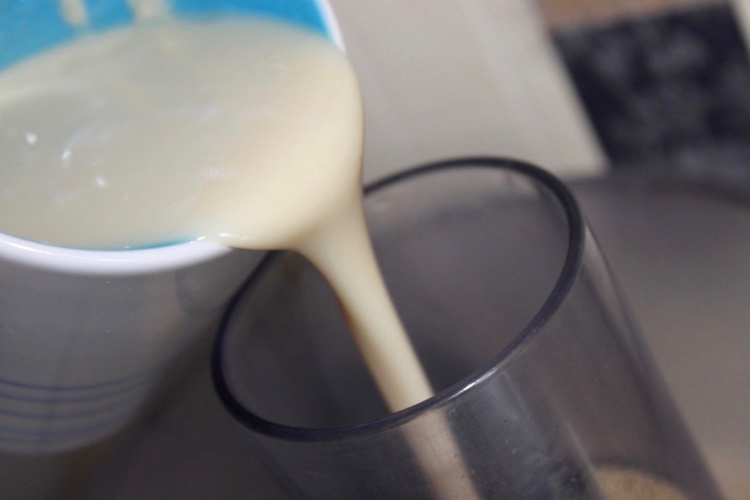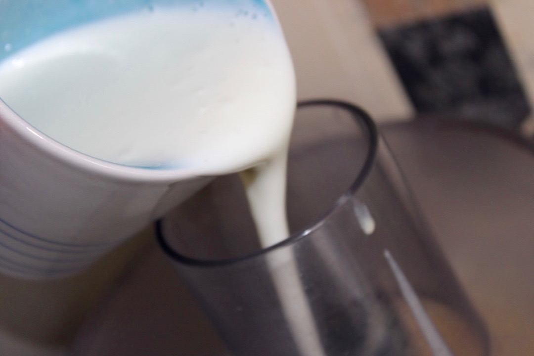 Dodawanie tłuszczu i jogurtu: Ciągle pracującym malakserze wlej szklankę tłuszczu, a następnie dodaj szklankę jogurtu naturalnego. Ucieraj, aż masa będzie jednolita.