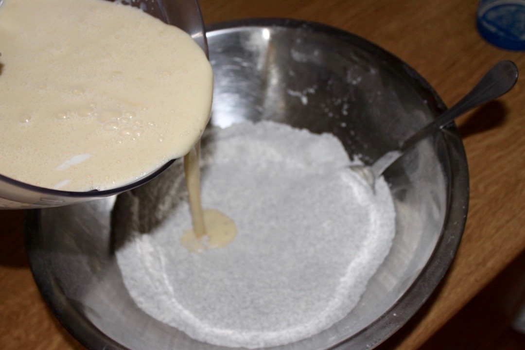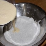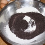 Łączenie mas: Wyłącz malakser. Masę przelej do miski z mąką i makiem.